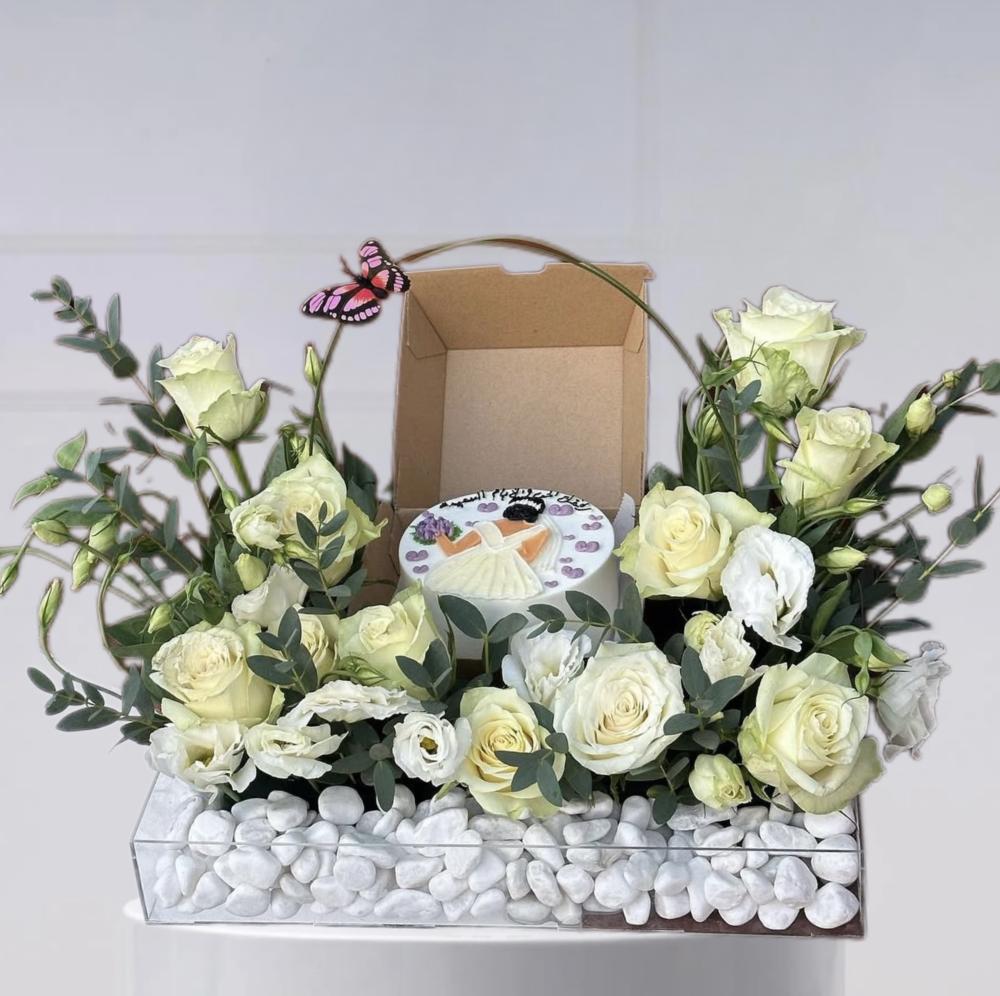 والتميز، تأسر القلوب وتُبهر الأنظار. كيكه مع الجوري الأبيض الناصع، رمز النقاء